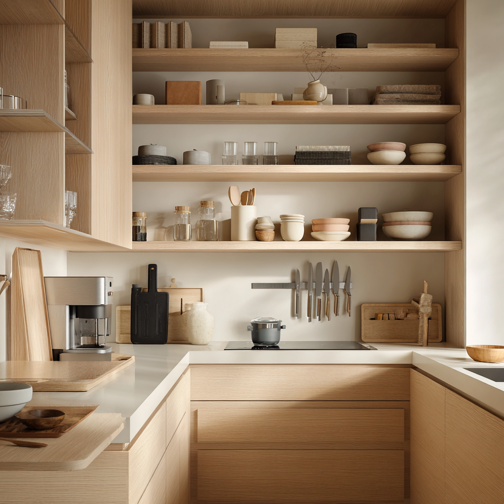 Każdy centymetr ma znaczenie. Półki w narożnikach i systemy wiszące pomagają wykorzystać przestrzeń pionową. To miejsce na przyprawy, słoiki lub kubki – zawsze pod ręką i bez bałaganu.